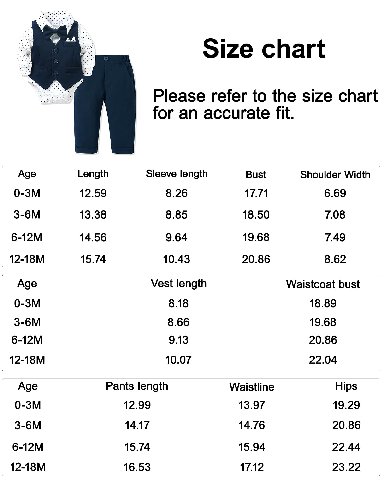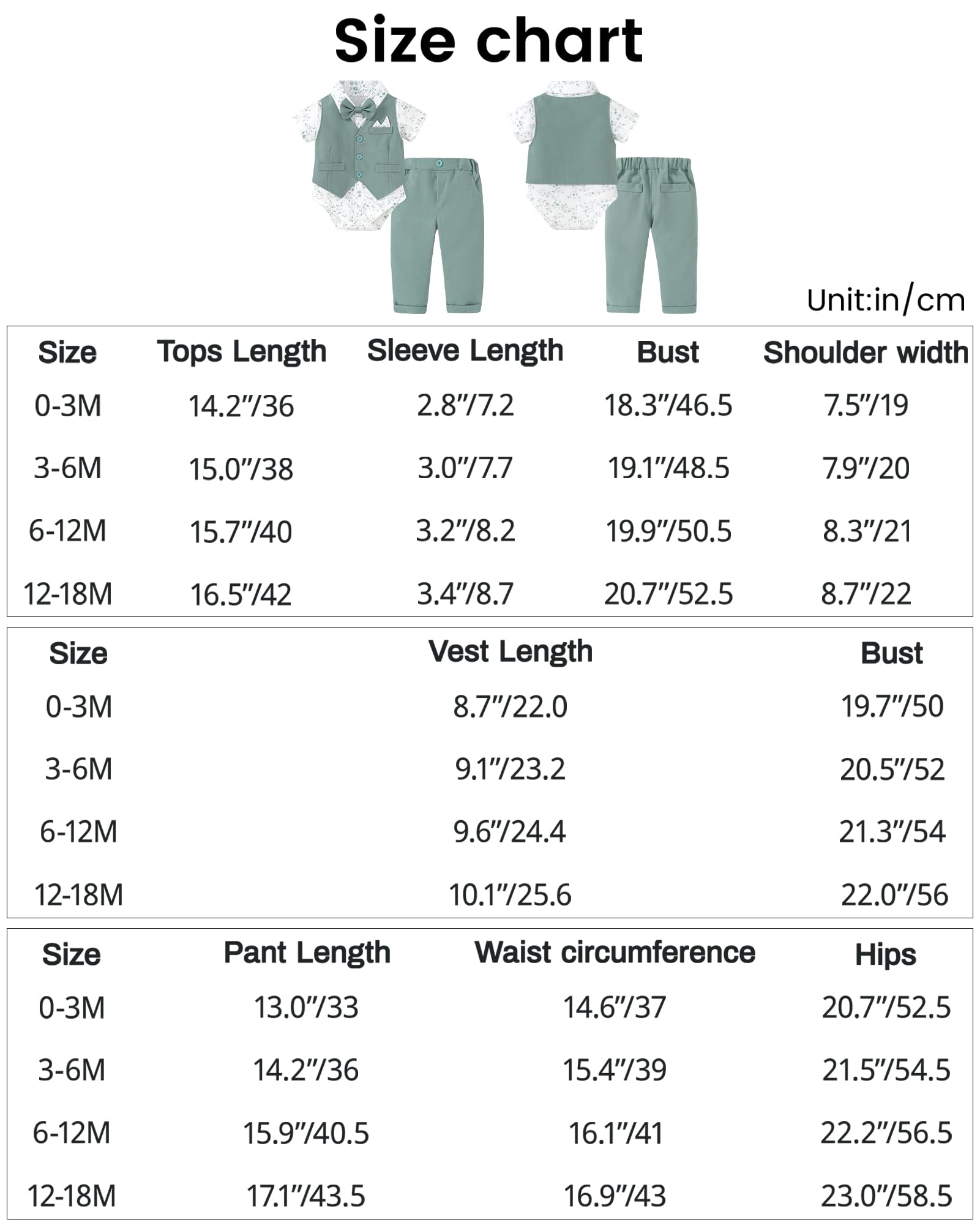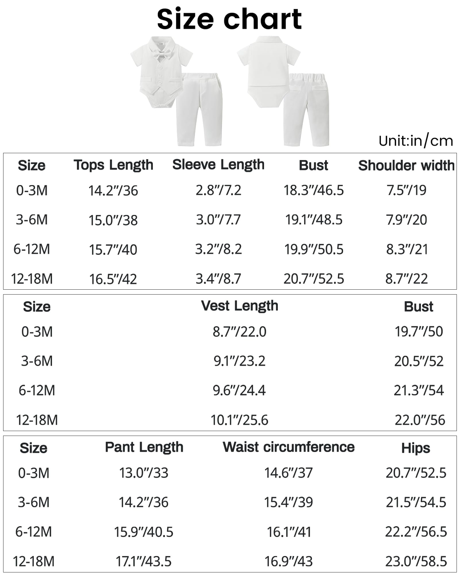 - √Size: We offer a range of sizes, including 0-3 months newborn baby boy clothes, 3-6 months infant boy suit, 6-12 months baby boy gentleman outfits, and 12-18 months baby boy tuxedo suit, ensuring a perfect fit for your growing baby boy. Please refer to our size chart to find the best size for your little one.